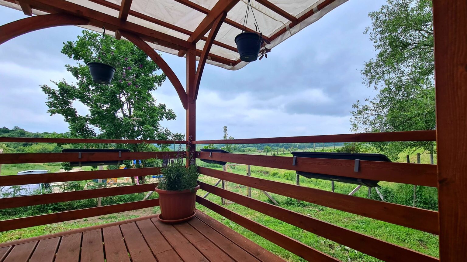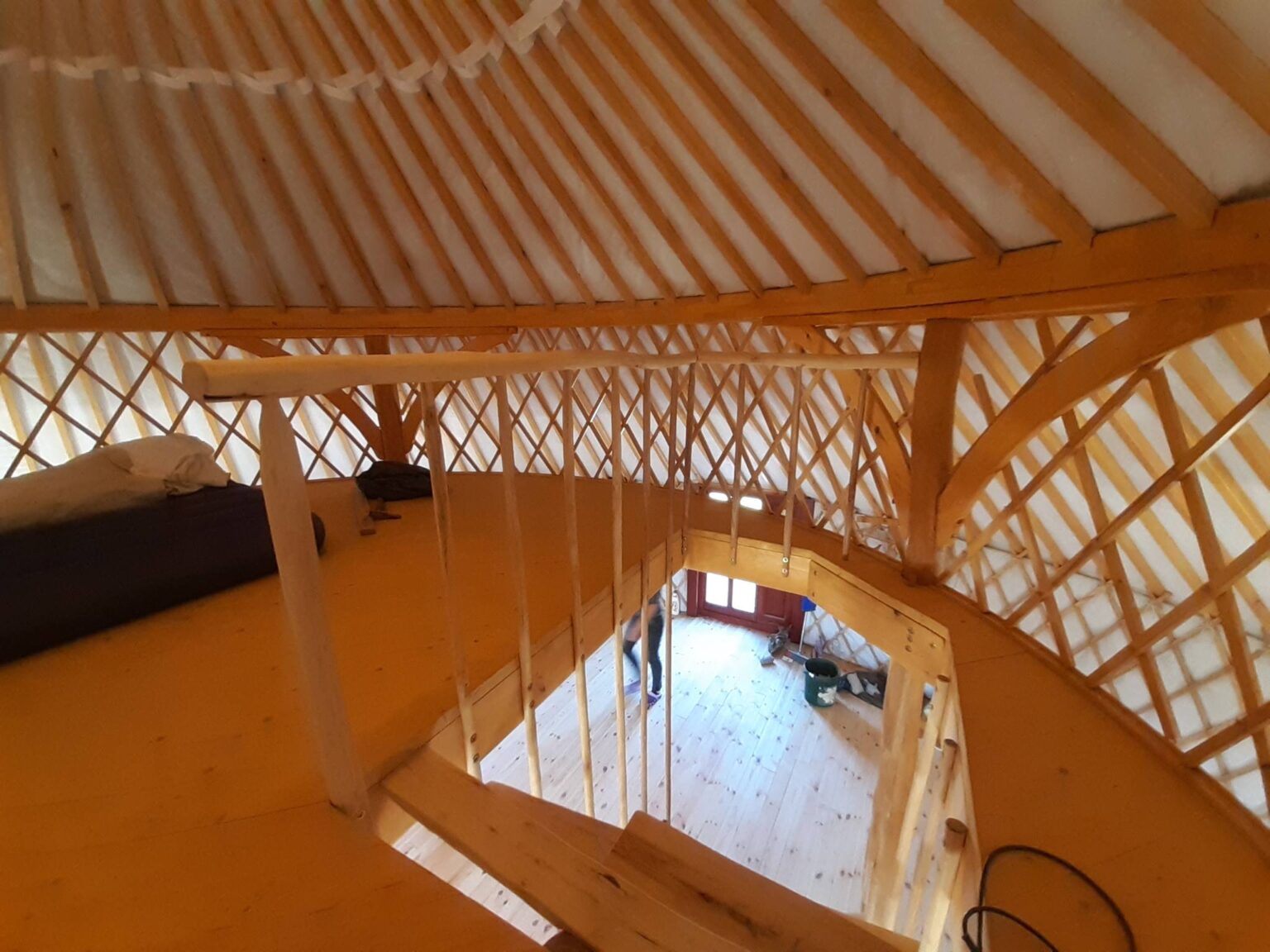 Jurta: Egyedi, teljes méretű, festett bejárati ajtó, 5 pontos biztonsági zárral, magasított jurta vázszerkezet belső, vízzel tisztítható szövetborítással (26 színben), belső párazáró fólia, külső Solflex nemezelt hőtükörfólia között 20 cm vastag Ursa 0,034-es üveggyapot szigetelés, szigetelés párnafák, Airtex ponyva 24 színben, az ajtó fölött egyszerű, festett előtető, két rétegű, gázzal töltött polikarbonát tetőkupola, rejtett távirányítású mozgatással, a fa részek festése, egyedi intarziás istenfa (a jurta tartóoszlopa).